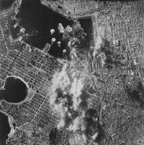 Πρώτοι βομβάρδισαν οι Αμερικανοί. Ο αμερικανικός σχηματισμός των τετρακινητήριων Boeing-Β17 Flying Fortress 494 που ανήκαν στην 5η πτέρυγα μάχης της 15 ης αεροπορικής στρατιάς απογειώθηκε από την ιταλική βάση Φότζια και Τάραντα υπό την συνοδεία δικινητήριων μονοθέσιων καταδιωκτικών, Lockheed P38 Lightning της 14ης Σμηναρχίας Μαχητικών, για προστασία από επίθεση αεροσκαφών του Άξονα και με περίπου 100 εμπρηστικές βόμβες κατάφεραν να πλήξουν το ιστορικό κέντρο του Πειραιά.