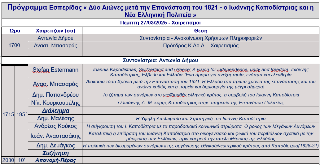 Εσπερίδα με θέμα: «Δύο Αιώνες μετά την Επανάσταση του 1821 - Ο Ιωάννης Καποδίστριας και η Νέα Ελληνική Πολιτεία»