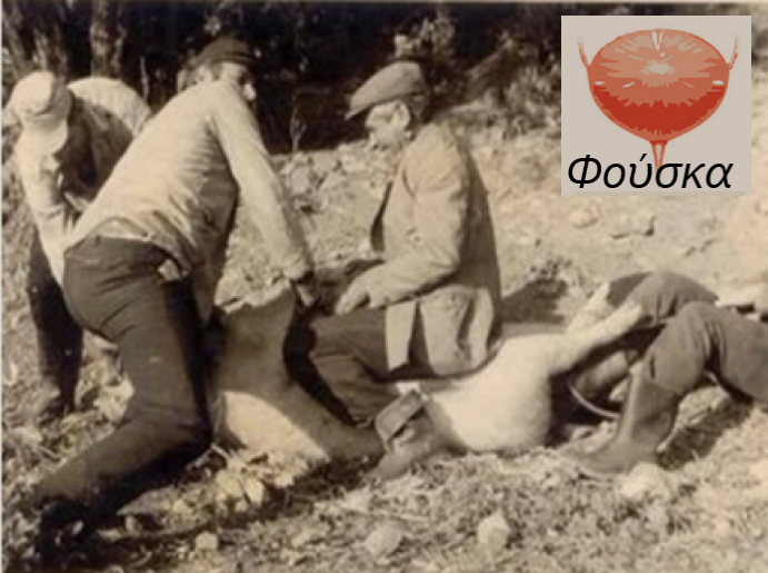 Και μεις τα τρία μικρότερα, και πιο πολύ εγώ, με λαχτάρα καρτερούσαμε τη φούσκα (ουροδόχος κύστη) του γουρουνιού. Μόλις σφάζονταν, δεν το κουνούσαμε ρούπι. Ούτε ανάσα δεν παίρναμε από την αγωνία πότε θα φτάσει ο σφαγέας στο ξεκοίλιασμα να βγάλει τ' άντερα και τη φούσκα, να την αρπάξουμε πρώτοι εμείς, συνήθως τα μικρότερα. Την αρπάζαμε αμέσως ζεστή - ζεστή, όλο χαρά κι ικανοποίηση, την κρατούσαμε για λίγο στα χέρια μας, ευλαβικά., σαν τρόπαιο νίκης και άρχιζε στη συνέχεια η ιεροτελεστία. Τη χτυπούσαμε στη στάχτη, τη φουσκώναμε με το στόμα μας, βάζαμε σπυριά καλαμπόκι για να βροντάει παίζοντας και την κάναμε μπαλόνι ή μπάλα για ποδόσφαιρο.