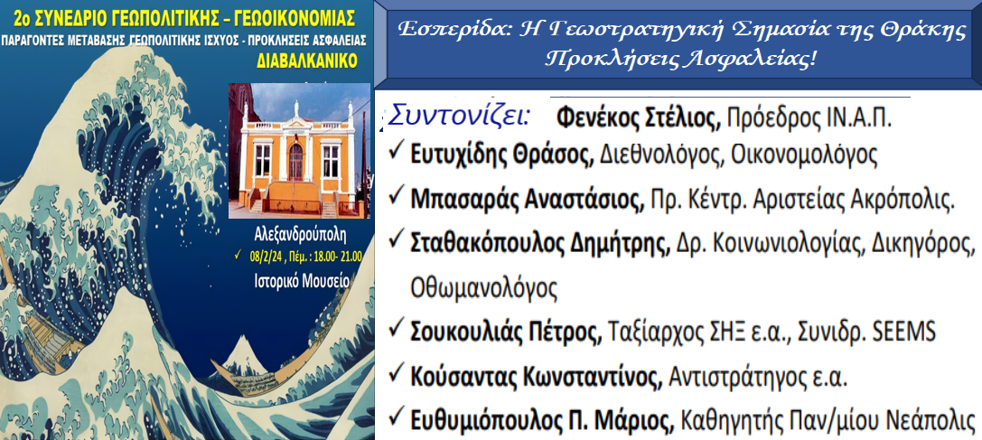 Η γεωστρατηγική σημασία της Θράκης-Προκλήσεις ασφαλείας είναι το θέμα που απασχόλησε τις εργασίες της πρώτης ημέρας στο Ιστορικό Μουσείο της Αλεξανδρούπολης.
