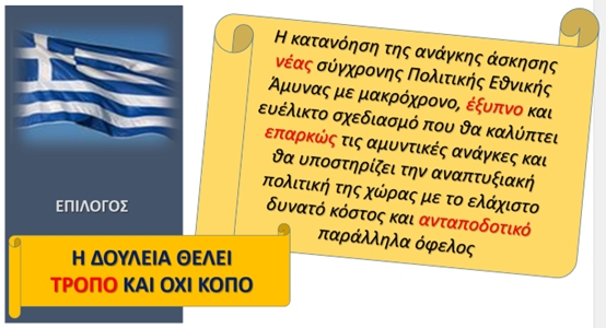 Λοιπόν, σκοπός της σημερινής μου τοποθέτησης είναι να τονίσω την ανάγκη εφαρμογής νέας Πολιτικής Εθνικής Άμυνας με αναγκαιότητα προσαρμογής σε χαλεπούς καιρούς. Πρέπει να αξιοποιήσουμε τις εμπειρίες του παρελθόντος αναθεωρώντας αυτά που βιώσαμε μεταπολεμικά: