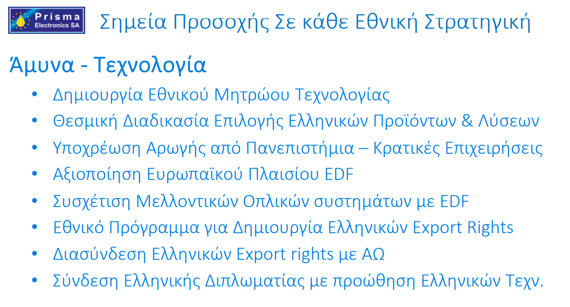 Σήμερα οι πρόσφατες εκσυγχρονιστικές – εξοπλιστικές κυβερνητικές επιλογές δημιουργούν ελπιδοφόρες προοπτικές δημιουργίας μακροχρόνιας Ικανής Αμυντικής ισχύος που θα βασίζεται στην ποιότητα έμψυχου και άψυχου υλικού, σε υγιείς εγχώριες υποδομές, στην συμμαχική υποστήριξη και σε ικανή και έξυπνη διοίκηση & πολιτική εντός και εκτός της χώρας. Για να επιτύχει αυτό το νέο ξεκίνημα απαιτούνται συνεργασίες που υπαγορεύει η τεχνολογία και ο ανταγωνισμός των κολοσσών του αμυντικού τομέα. Συνεργατικά σχήματα, συμπαραγωγές με εγχώρια συμμετοχή σε όλα τα επίπεδα και ωριμότητα αυτών που τις σχεδιάζουν και αυτών που την εκτελούν.