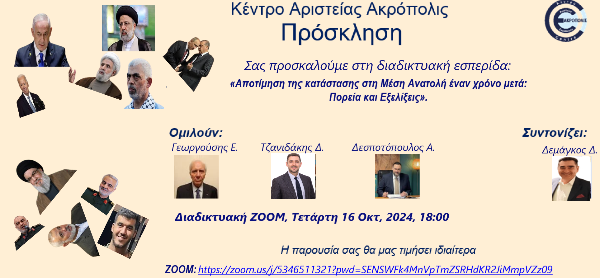 Το Κέντρο Αριστείας «Ακρόπολις», την Τετάρτη 16 Οκτωβρίου 2024, στις 18:00, διοργάνωσε διαδικτυακή εσπερίδα με θέμα: «Αποτίμηση της κατάστασης στη Μέση Ανατολή έναν χρόνο μετά: Πορεία και Εξελίξεις».