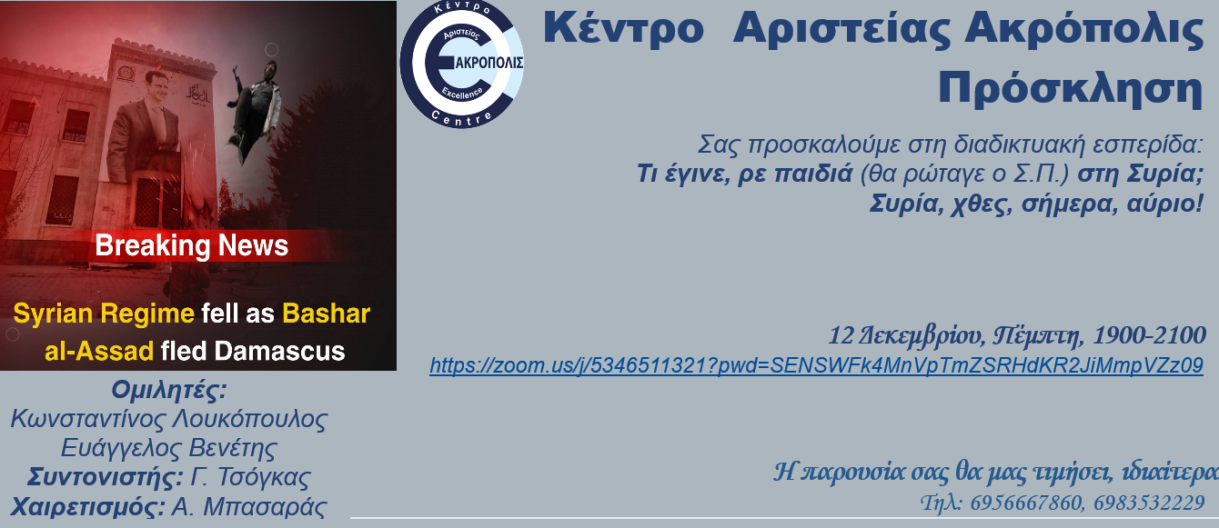 «Η 8η Δεκεμβρίου 2024 ανέτειλε με μια ιστορικής σημασίας εξέλιξη για τη Συρία και τη Μέση Ανατολή γενικότερα. Οι δυνάμεις των Σύριων ανταρτών σε συνεργασία με άτακτες ομάδες εθνικιστών διωκόμενων του Άσαντ και Τζιχαντιστών, κατέλαβαν τη Δαμασκό ανατρέποντας το καθεστώς Άσαντ (που κυβέρνησε επί 50 και πλέον χρόνια τη Συρία), σηματοδοτώντας παράλληλα, τον τερματισμό των 13 ετών εμφυλίου σπαραγμού στη Συρία.