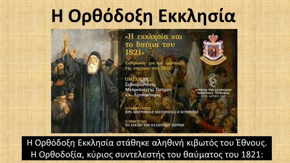 Η Ορθόδοξη Εκκλησία στάθηκε αληθινή κιβωτός του Έθνους. Η Ορθοδοξία, κύριος συντελεστής του θαύματος του 1821: Η ακαταγώνιστη δύναμη της πίστης εκδηλώθηκε στις σημαίες-σύμβολα του Αγώνα, στην Παιδεία, στον Κλήρο, στην Ηγεσία του τόπου.