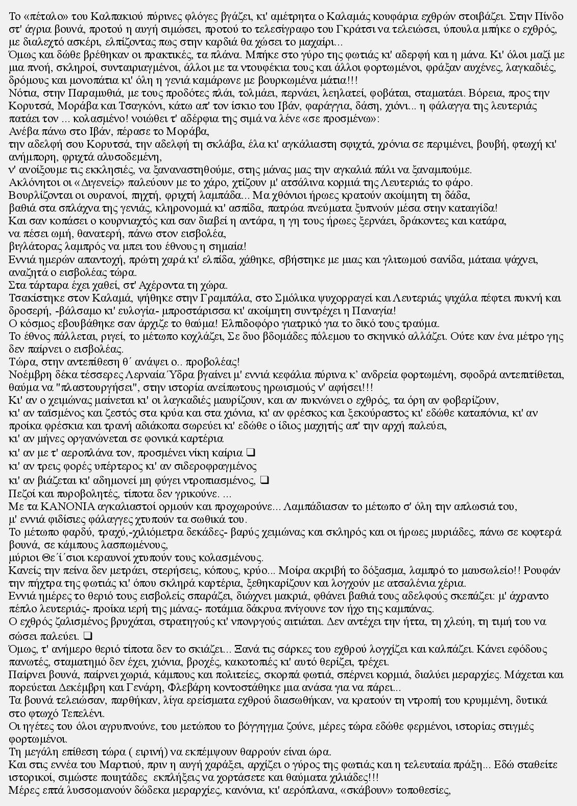 Μια Οδύσσεια αναμνήσεων και χαράς, από τους Αγίους Θεοδώρους της μάννας μου, στο ιστορικό και γκρεμισμένο από χθες ονειρικό γεφύρι των παιδικών μου μπάνιων, το γεφύρι της Πέτρας της Σαρακίνας, στους βράχους της καρδιάς μου, τα Μετέωρα, στον παιδικό μου παράδεισο, στις κατασκηνώσεις της Τρυγόνας, στον τόπο όπου το χειμώνα 'χορεύουν οι διάβολοι', την κακοτράχαλη, όταν χιονισμένη Κατάρα, στις ατέλειωτες στροφές της Πίνδου, στο νησάκι της κυρά Φροσύνης και στον θερινό μοσχομυροβολούντα σινεμά, στην Τιτάνια στα Γιάννινα και ξαναείδα την Βιολετέρα μου, το πανέμορφο μονότοξο γεφύρι της Κόνιτσας, τα όμορφα δυτικά χωριά του Σμόλικα πάνω από τον Αώο, στο Δίστρατο της ζωής και κατέληξα στις καταγάργαρες πηγές και λίμνες του Αώου. Ενας πανέμορφος τόπος που σιγά σιγά ερημώνει. Μακριά από τουριστικές "λεωφόρους", ακόμα κι από "παρόδους" του τουρισμού, ωστόσο, ο τόπος αυτός διατηρεί ατόφιο το χαρακτήρα του.